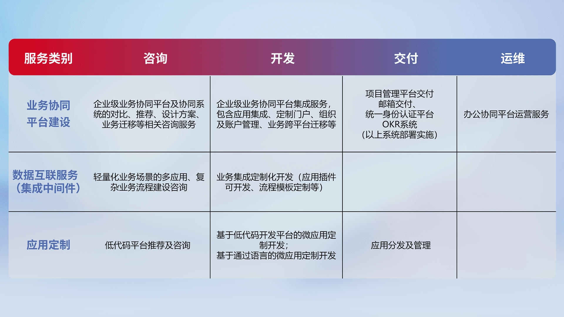 针对钉钉、、企微、、、、IDaas等平台级产品提供产品的规划、、、方案、、、、交付、、、、定制化开发等服务,,,,实现如统一协同办公、、智能客户服务、、、混合会议管理、、智能数据查询、、等业务场景,,实现数字化转型。。。