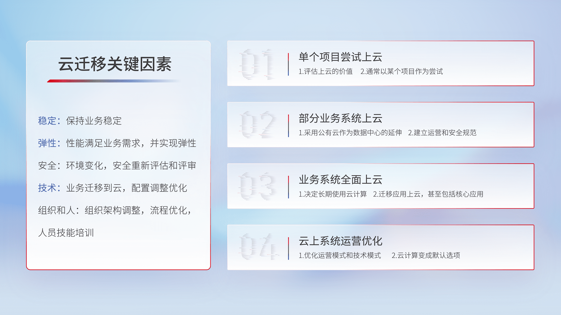 结合实际业务,,,从规划设计、、、云平台选型、、、云原生改造、、、、数据迁移、、、、集成交付,,,迁移全过程为客户识别最佳上云路径,,做好风险识别管理,,设计网络架构、、身份权限、、安全审计合规、、、操作审计、、日志审计、、监控告警策略、、多站点容灾设计等,,对云上基础设施进行整体规划,,,提升IT治理水平,,,,以满足弹性、、、、高可用、、、高性能的需求。。。