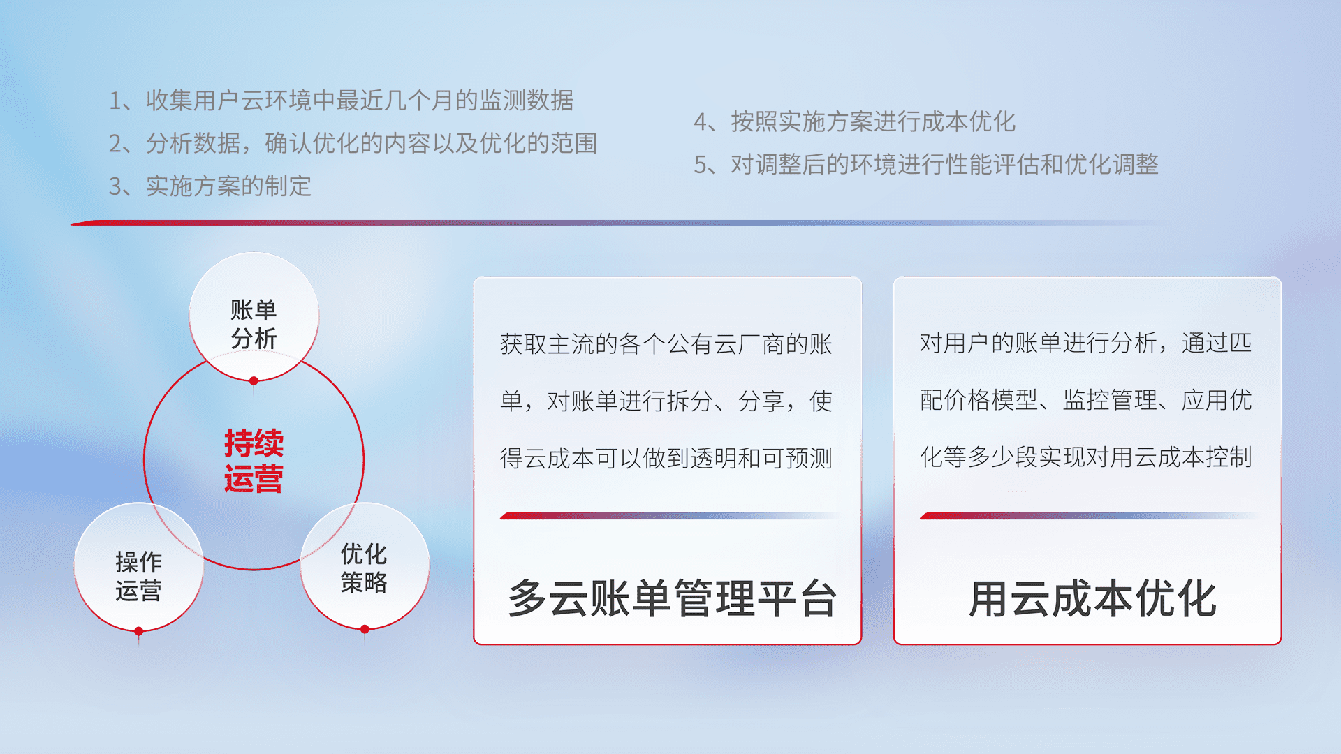 通过多云纳管,,以统一的资源数据模型把客户的云资源进行抽象和封装,,,进而实现对多云资源的统一操作,,,保障云资源管理的可靠性、、、、稳定性与可用性。。量身定制化运维内容,,配置、、、、开发运维、、补丁管理、、备份、、、监控、、认证和访问管理、、、、审计和日常巡检等,,保障在用云过程中的可靠度,,,稳定度以及高可用率。。。。
