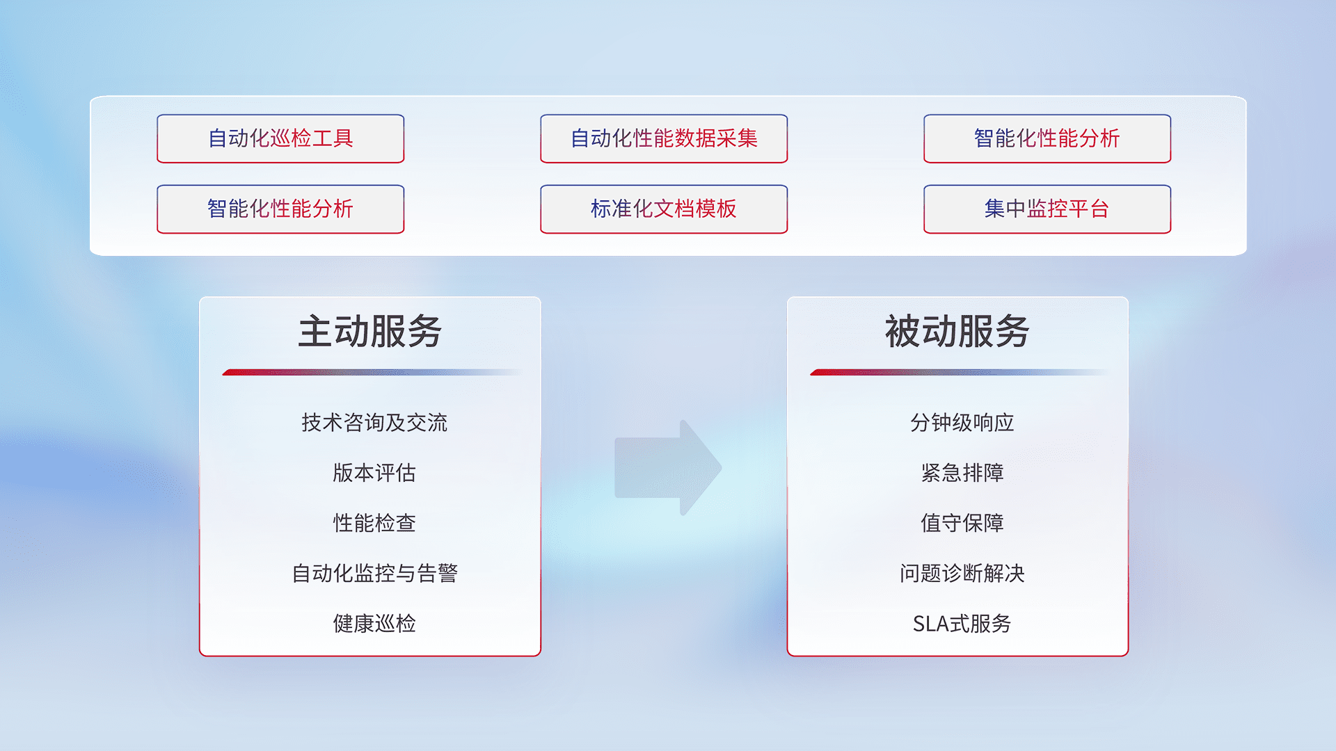 智能化工具和标准化文档,,保障服务质量,,,提供主动服务(包含技术咨询、、版本评估、、、、性能检查、、、自动化监控与告警、、、健康巡检)和被动服务包含(分钟级响应、、紧急排障、、、值守保障、、问题诊断解决、、SLA服务)。。。