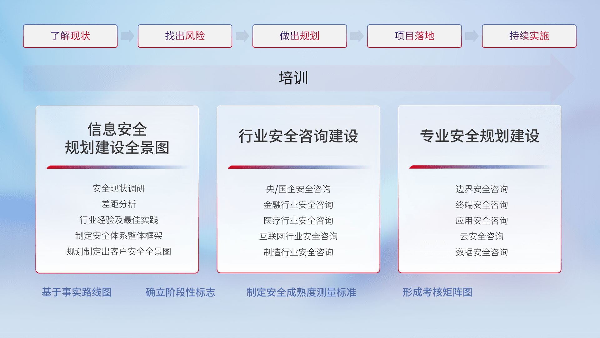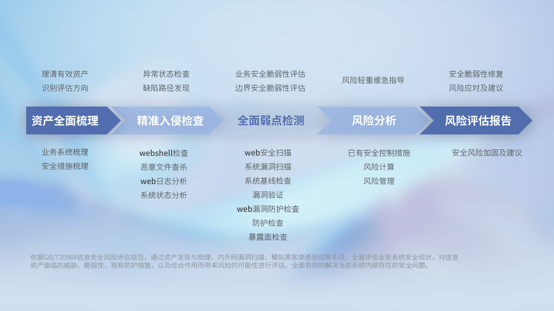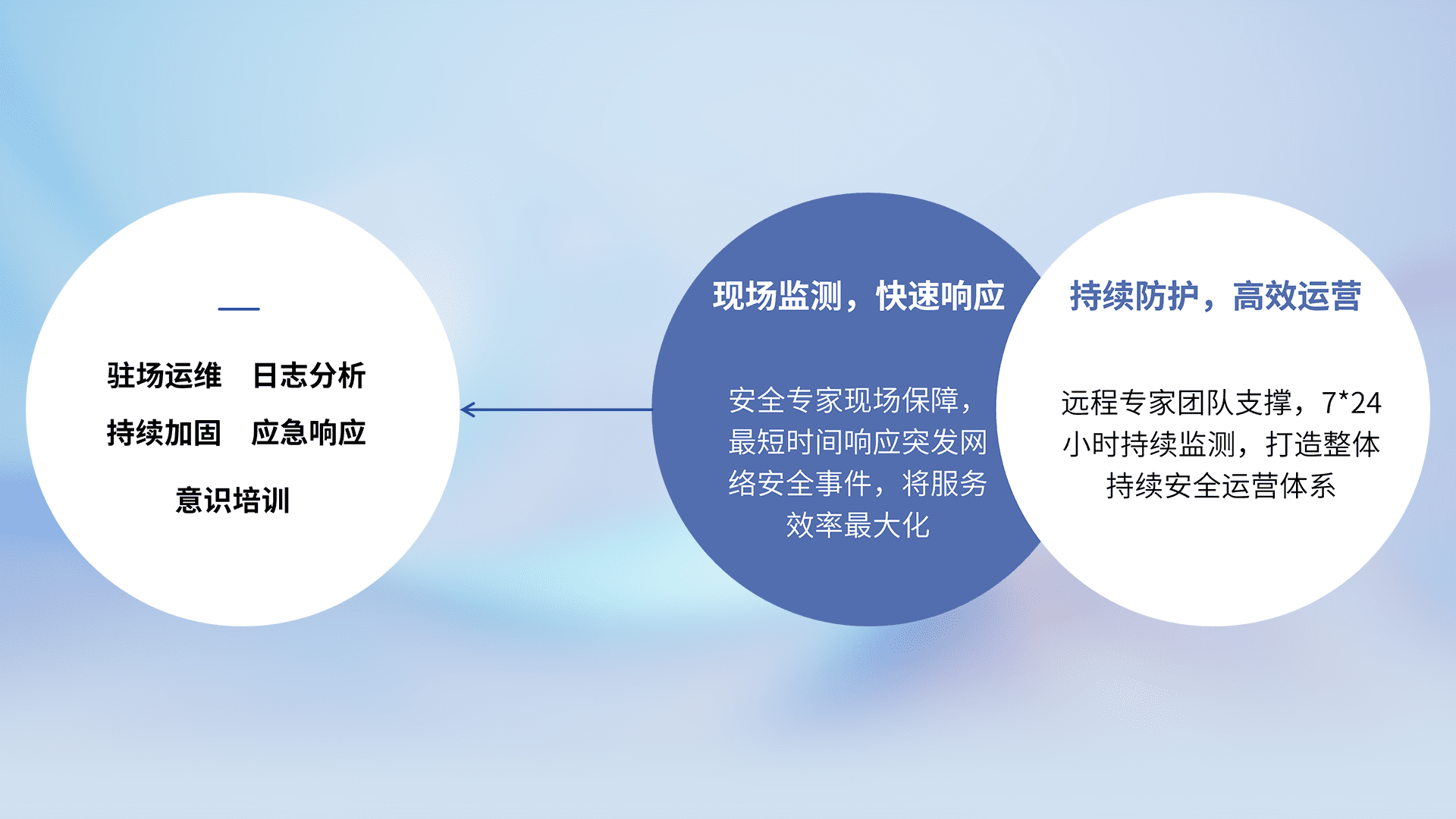 针对客户行业特性,,,,以专业的安全服务+多厂商联合解决方案提供专属的一站式安全管理服务,,,帮助客户全面感知网络空间威胁,,,,基于识别、、检测、、分析、、、、防护、、、监测、、响应的服务理论模型,,,,从方案咨询、、、集成交付、、、、评估验证、、、、优化加固、、、运维运营,,,致力于为客户提供完整的闭环管理式安全服务。。。以实战经验为客户打造高抵御风险的安全体系,,帮助客户发现威胁、、、、对抗威胁、、处置威胁,,不断积累安全对抗能力,,,持续保障数字化安全。。。。